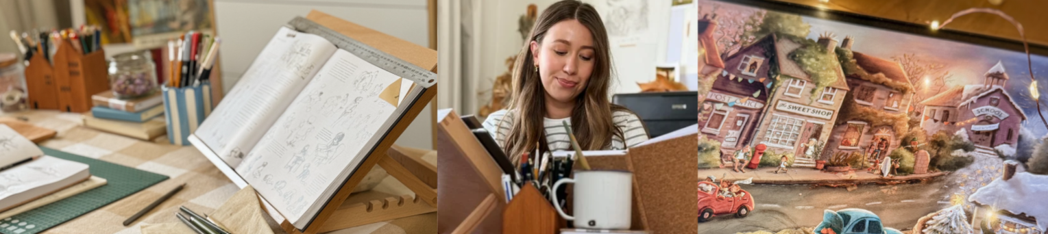 She takes inspiration from nostalgia, the way light can evoke feelings of comfort and magic, and human moments of humour and connection. Predominantly working digitally, Leanne also incorporates traditional linework into her process where possible, enjoying the spontaneity that hand and pencil create together.
